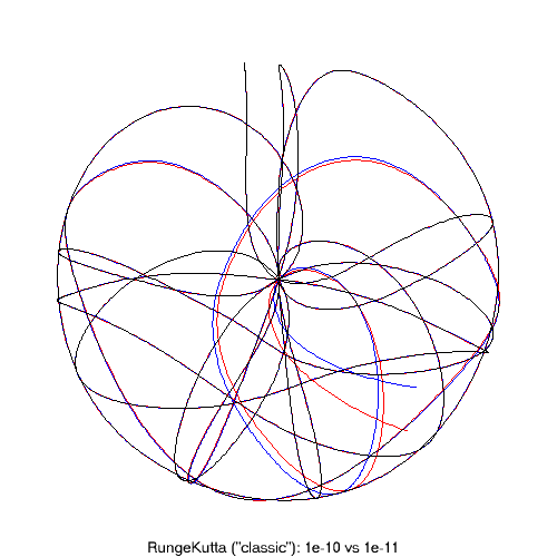 Vergleich des Runge-Kutta-Verfahrens ("klassisches", also ältestes RK-Verfahren) bei verschiedenen Diskretisierungsfehler-Schranken eps=1e-5 bis eps=1e-13. Wie immer adaptives Verfahren mit gleichen Anfangsbedingungen.